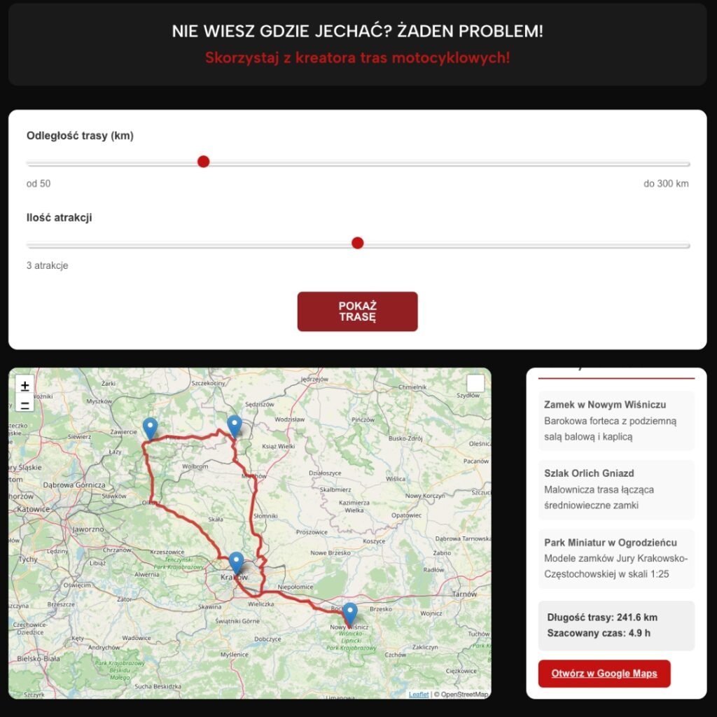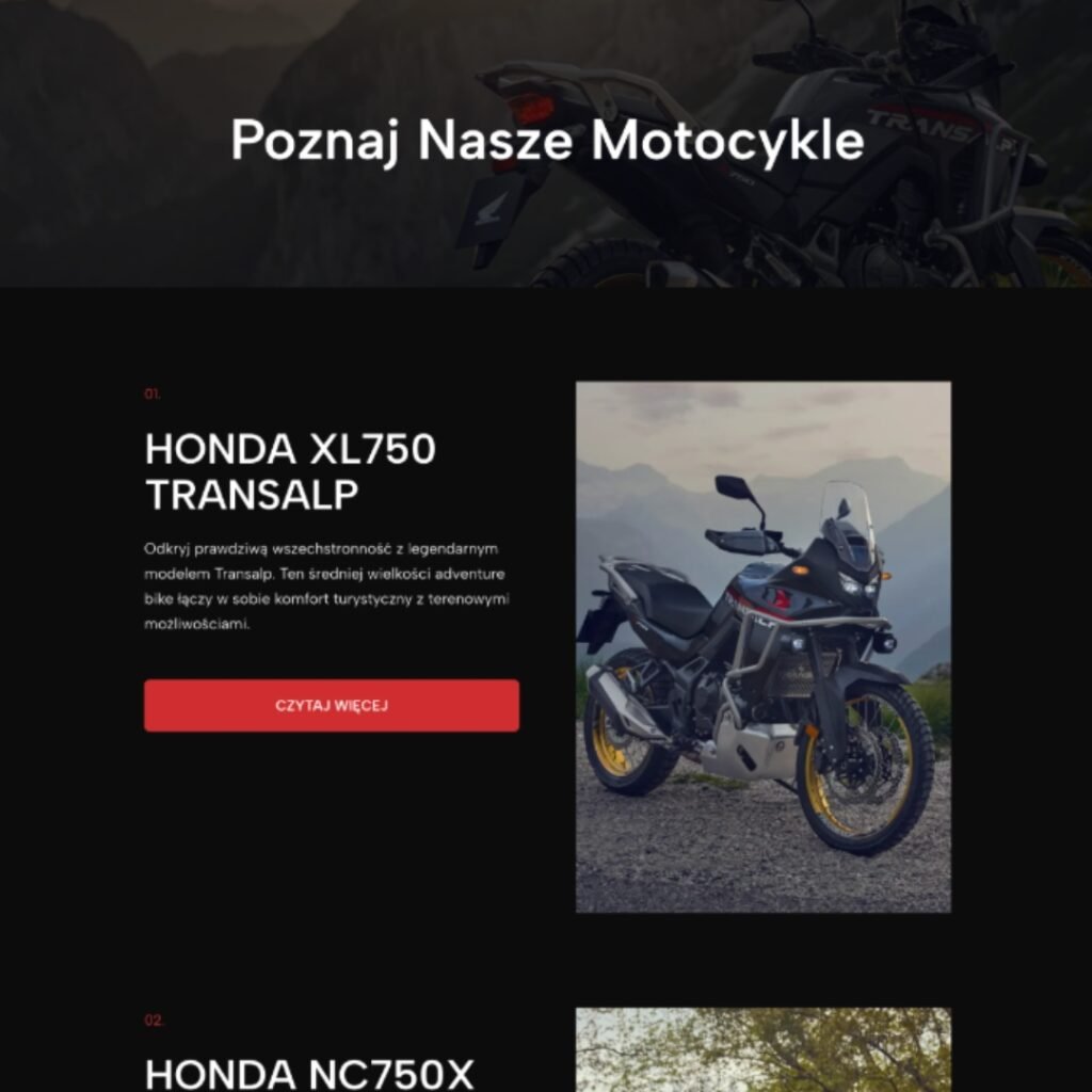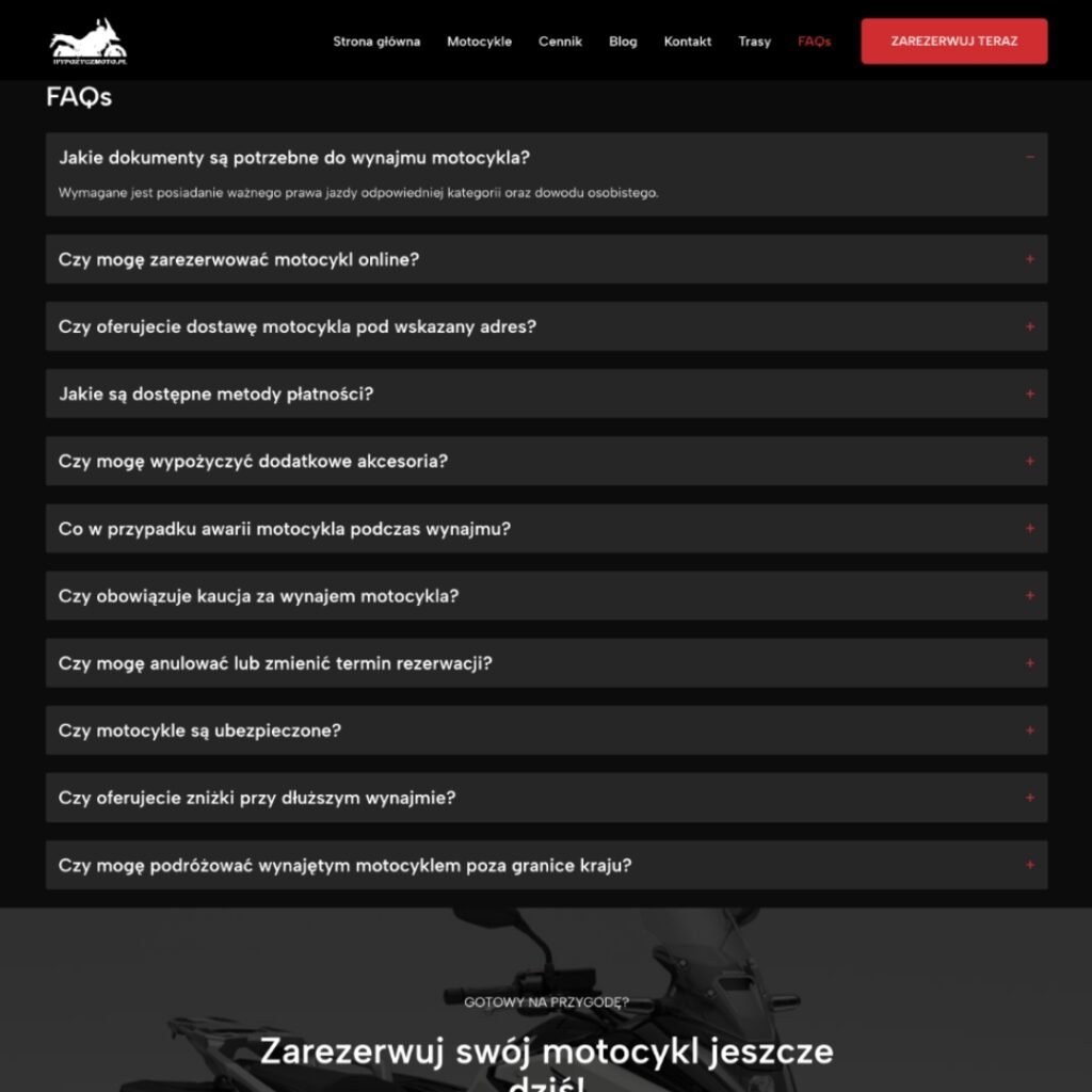Strona internetowa dla profesjonalnej wypożyczalni motocykli z Małopolski. Projekt obejmuje system rezerwacji online, prezentację floty najnowszych motocykli oraz kompleksową informację o usługach z naciskiem na bezpieczeństwo i pełne ubezpieczenie. Strona wyposażona w responsywny design i intuicyjny system bookingu.