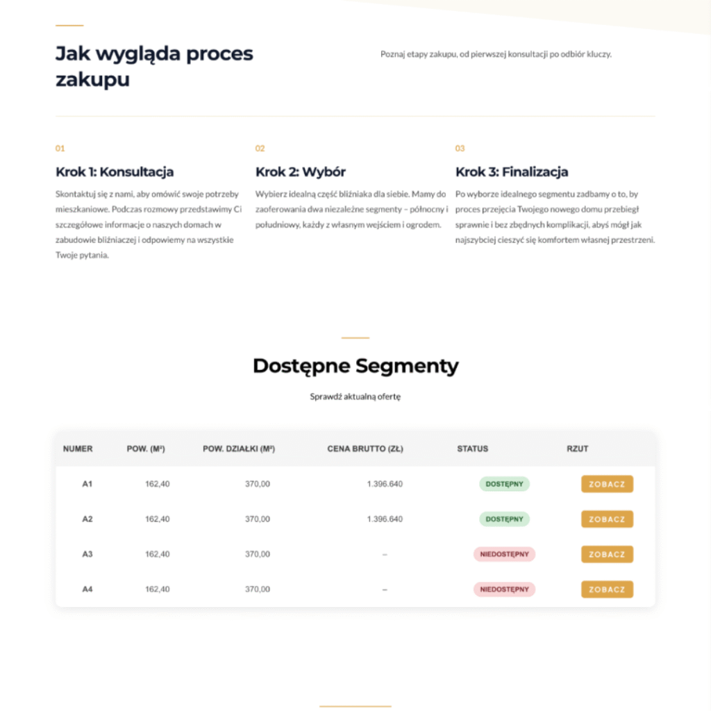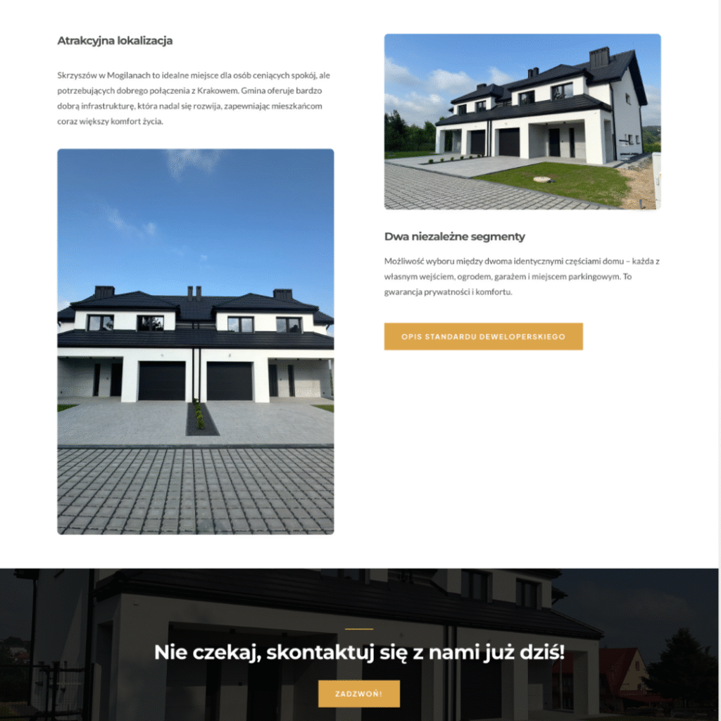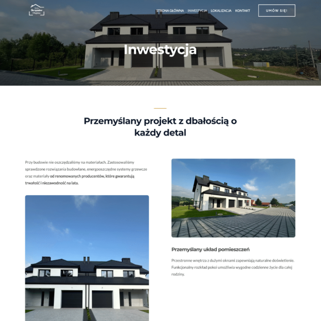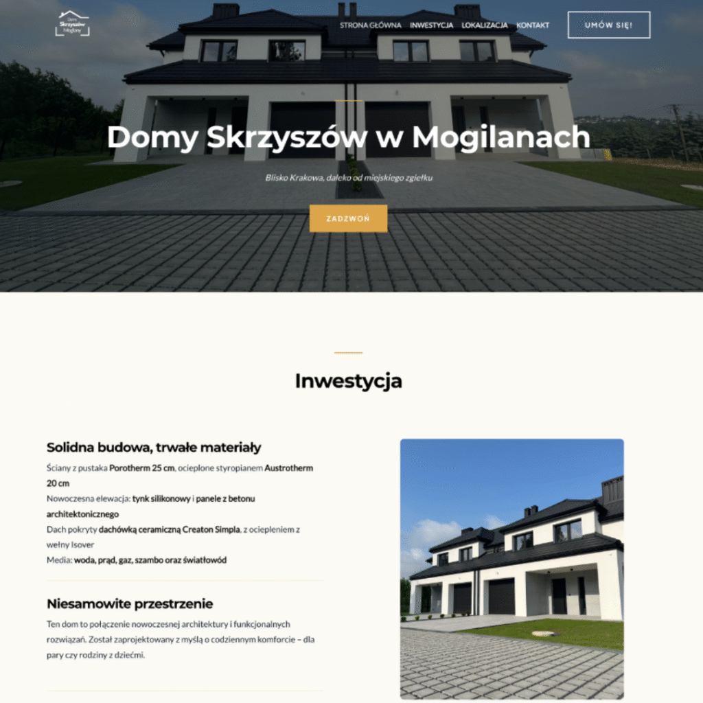 Strona internetowa dla inwestycji mieszkaniowej – prezentacja domów w zabudowie bliźniaczej koło Krakowa. Projekt obejmuje szczegółową prezentację nieruchomości z galerią zdjęć, wizualizacjami 3D, rzutami mieszkań oraz systemem prezentacji dostępnych segmentów. Strona wyposażona w responsywny design, galerie lightbox i intuicyjny kontakt z deweloperem.