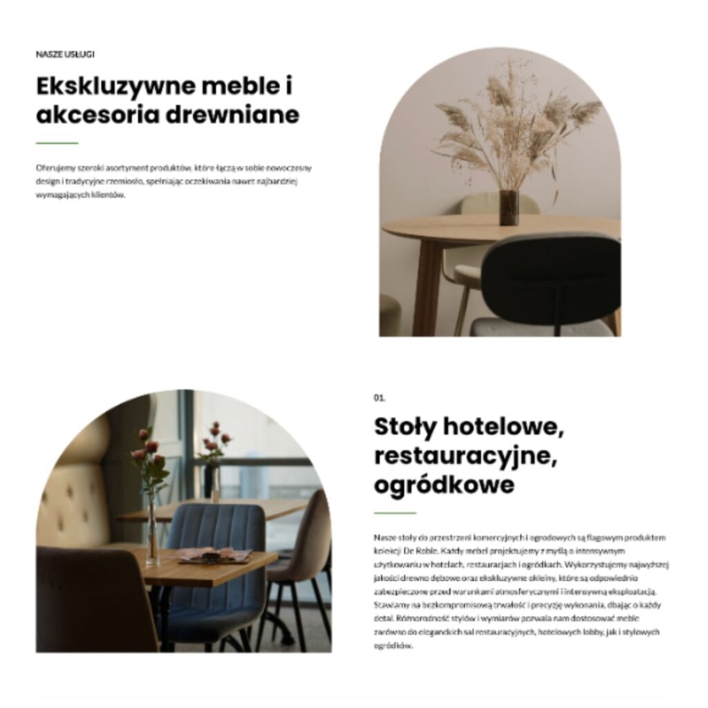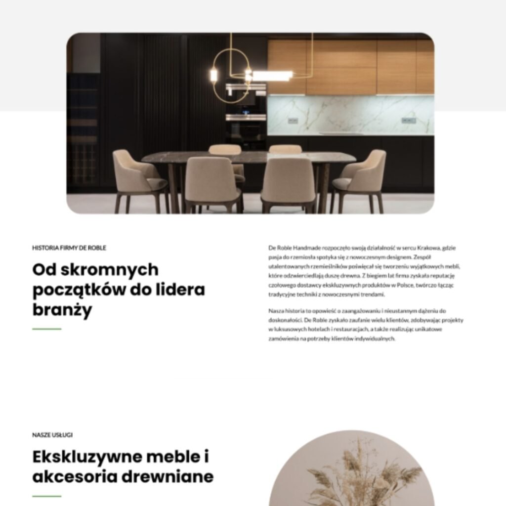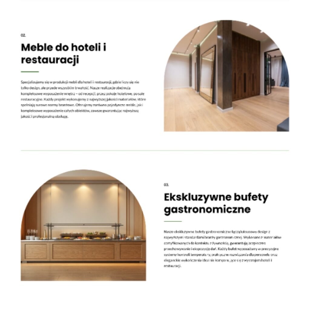 Strona internetowa dla krakowskiej manufaktury mebli specjalizującej się w ekskluzywnych produktach z drewna dla sektora HoReCa. Projekt prezentuje pełną ofertę firmy od stołów restauracyjnych po bufety gastronomiczne, z naciskiem na rzemieślniczą jakość i indywidualne podejście do klienta.