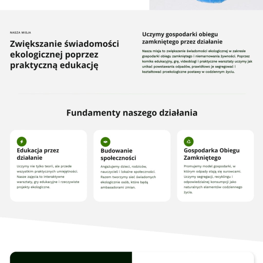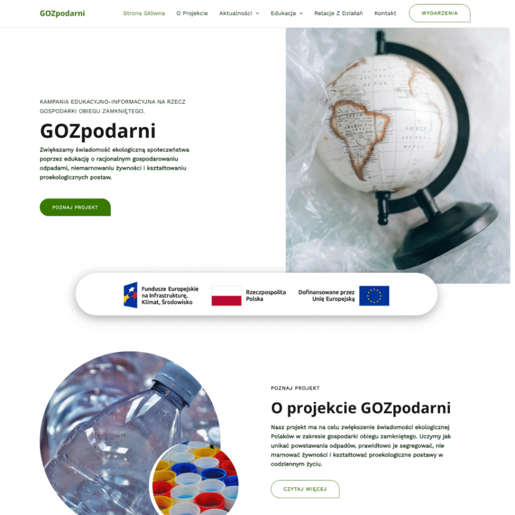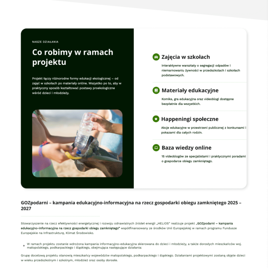 Strona internetowa dla projektu edukacji ekologicznej GOZpodarni prowadzonego przez Stowarzyszenie Helios. Projekt obejmuje kompleksową bazę wiedzy o gospodarce obiegu zamkniętego, serię 15 wideoblogów edukacyjnych, interaktywną grę quiz dla dzieci oraz komiksy dla uczniów. Strona wyposażona w kalendarz wydarzeń edukacyjnych, publikacje eksperckie i responsywny design dostosowany do potrzeb nauczycieli, rodziców i młodzieży.
