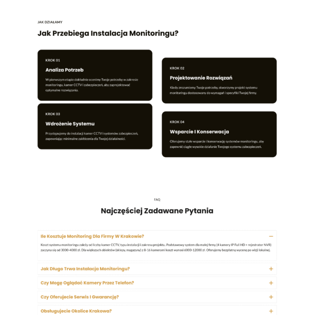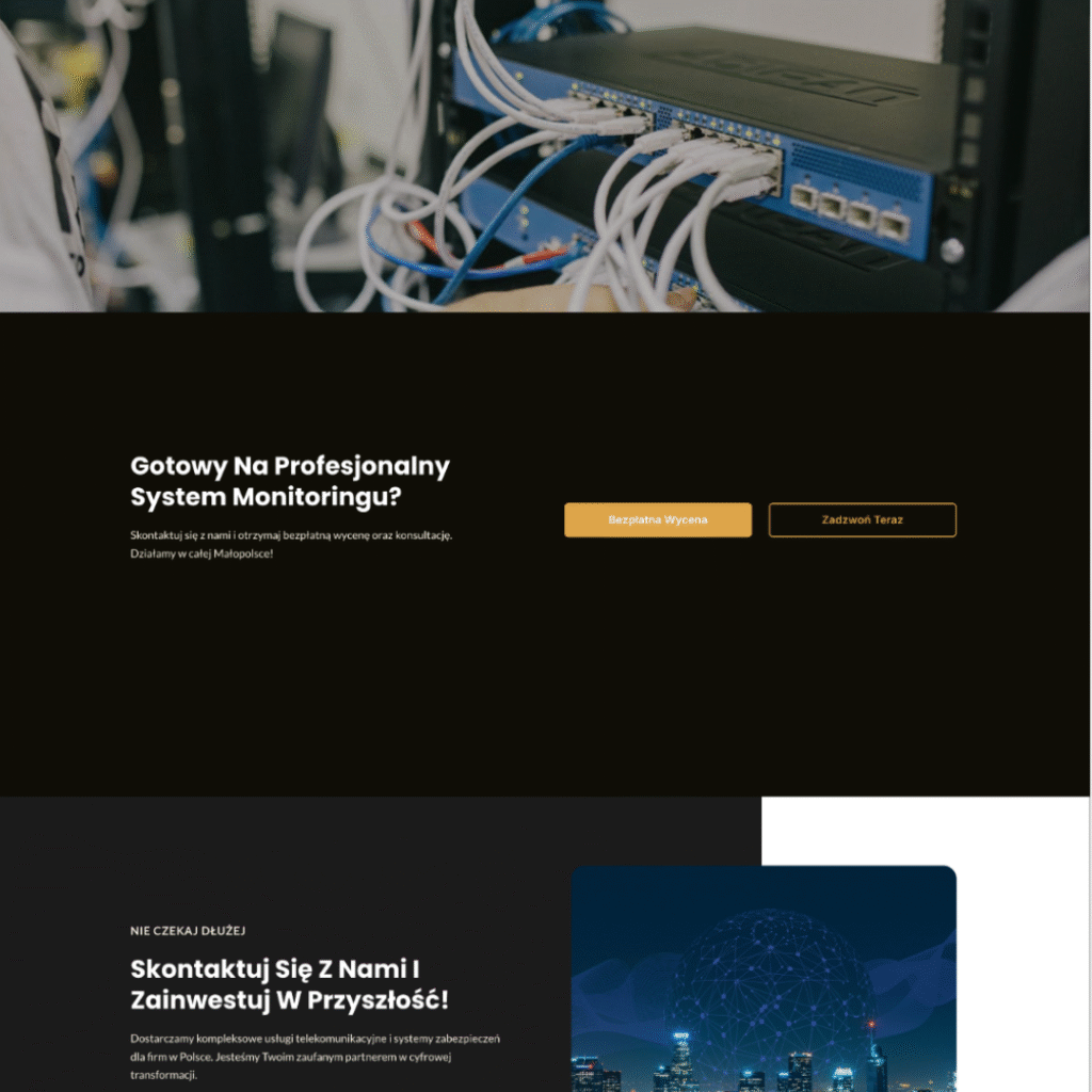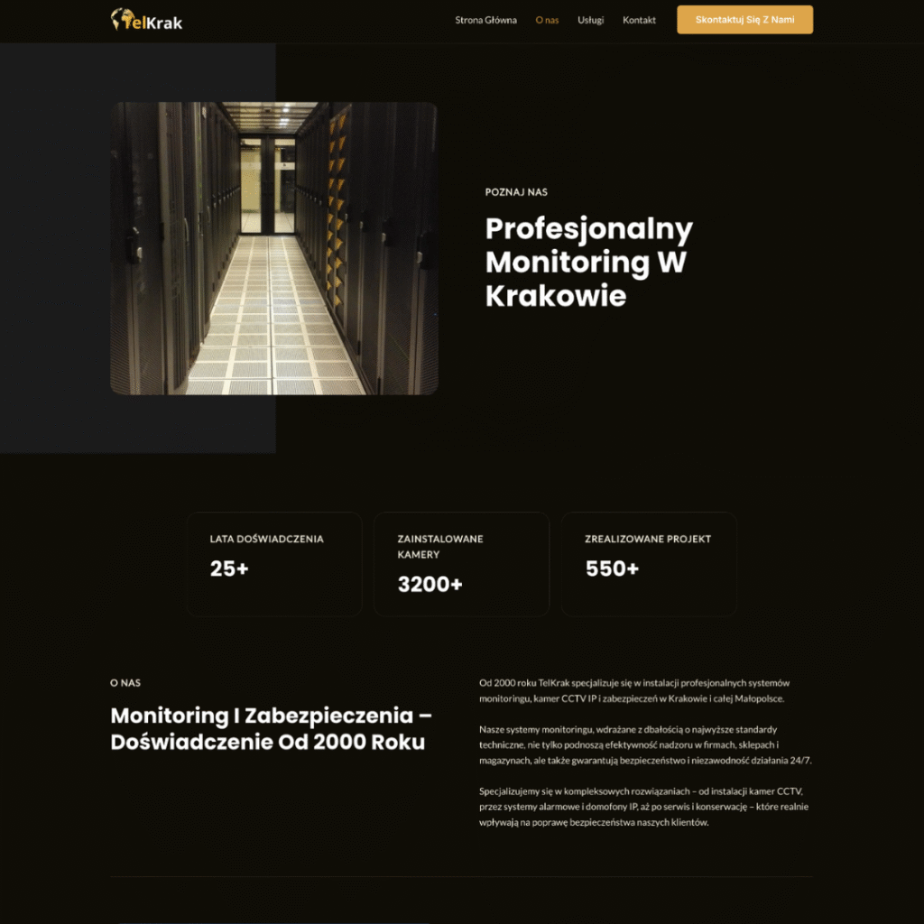 Strona internetowa dla krakowskiej firmy telekomunikacyjnej specjalizującej się w profesjonalnych systemach monitoringu CCTV, alarmów i domofon ów IP. Projekt prezentuje kompleksową ofertę usług od instalacji kamer Full HD i 4K po systemy nagrywania 24/7 z dostępem zdalnym, z naciskiem na doświadczenie 25-letnią, certyfikowaną jakość i indywidualne podejście do potrzeb firm i domów prywatnych w Małopolsce.